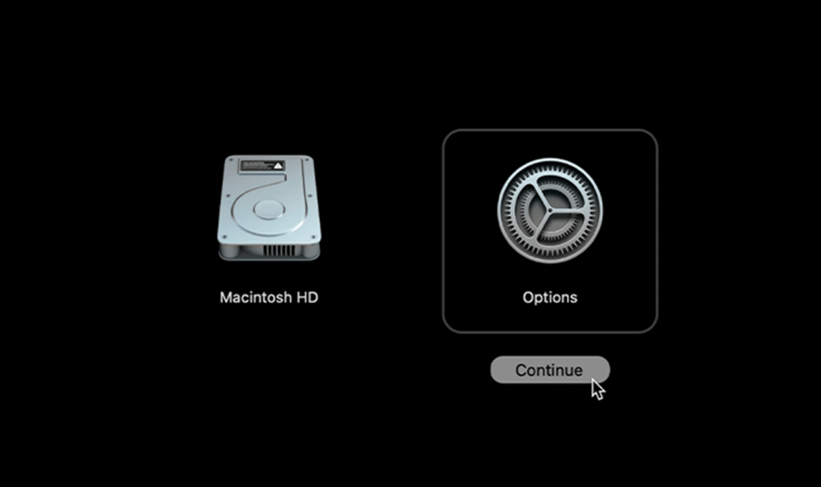 Once powered off, press and hold the power button on your computer until the Recovery Mode screen appears, pictured below.