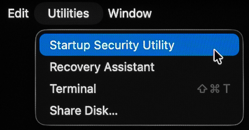 At the Apps Menu in the top left corner, select “Utilities” and then “Startup Security Utility”.