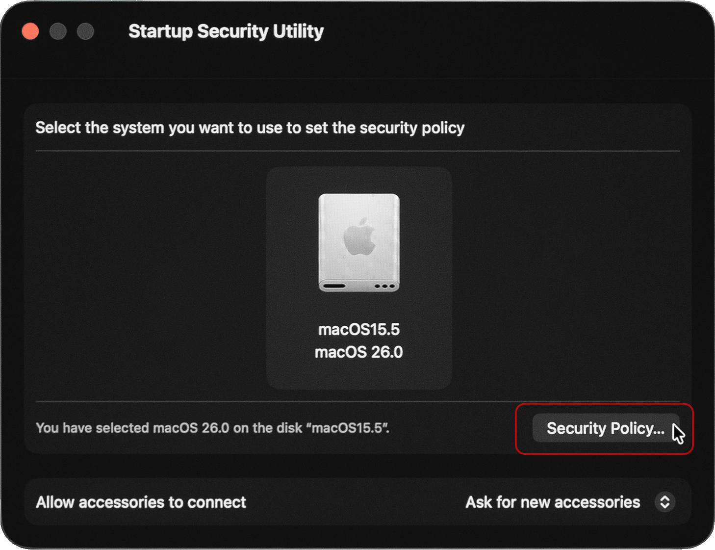 Select the macOS disk and then the “Security Policy” button.