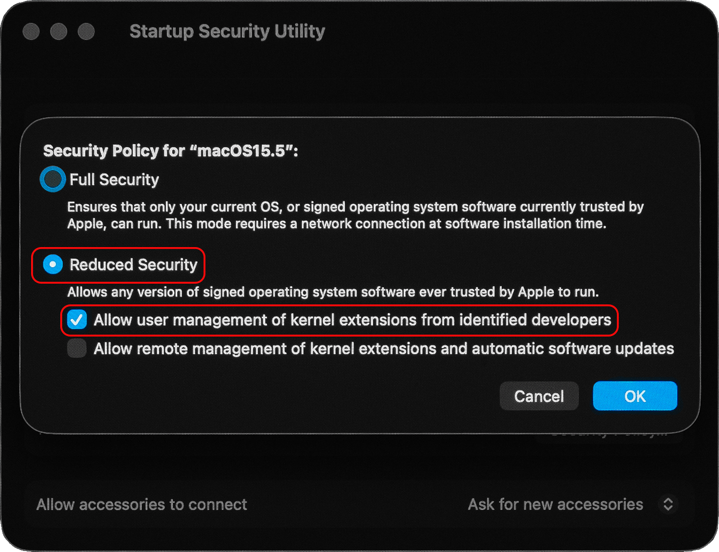 From here, select “Reduced Security” and “Allow user management of kernel extension from identified developers” and then click “OK”.