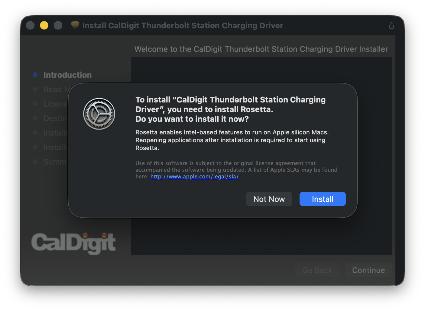 If you are installing the drivers for a Thunderbolt 3 CalDigit dock or earlier and using an Apple Silicon Mac, you may be prompted to install Rosetta. If so, press “Install” and allow the installation to complete before continuing the driver installation.