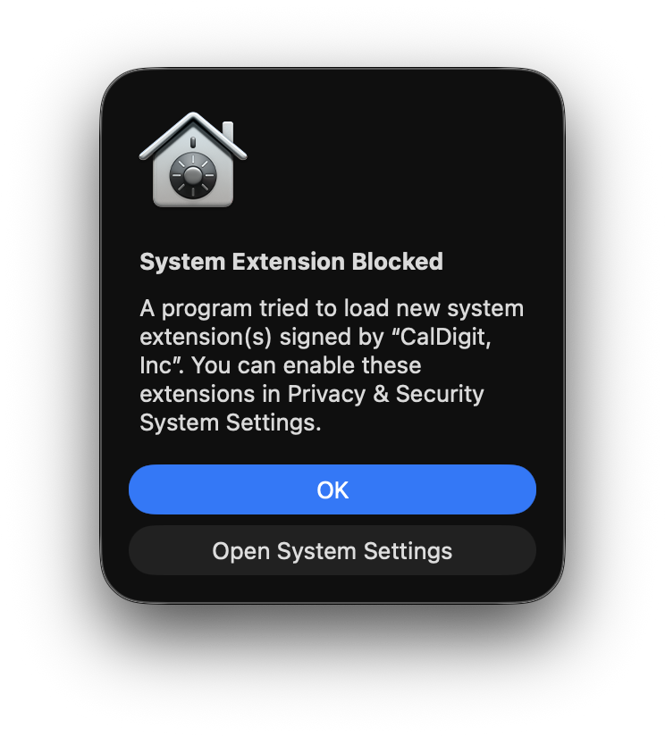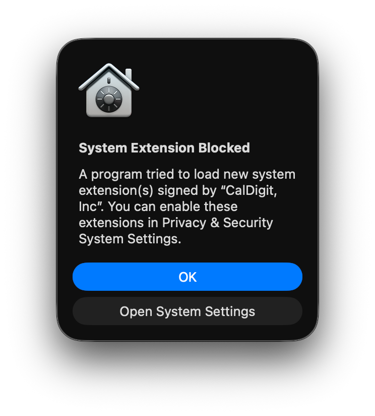 When installation is complete, you may be prompted with a “System Extension Blocked” pop-up, notifying you that the driver is being blocked by macOS. If this happens, press “Open System Settings”.