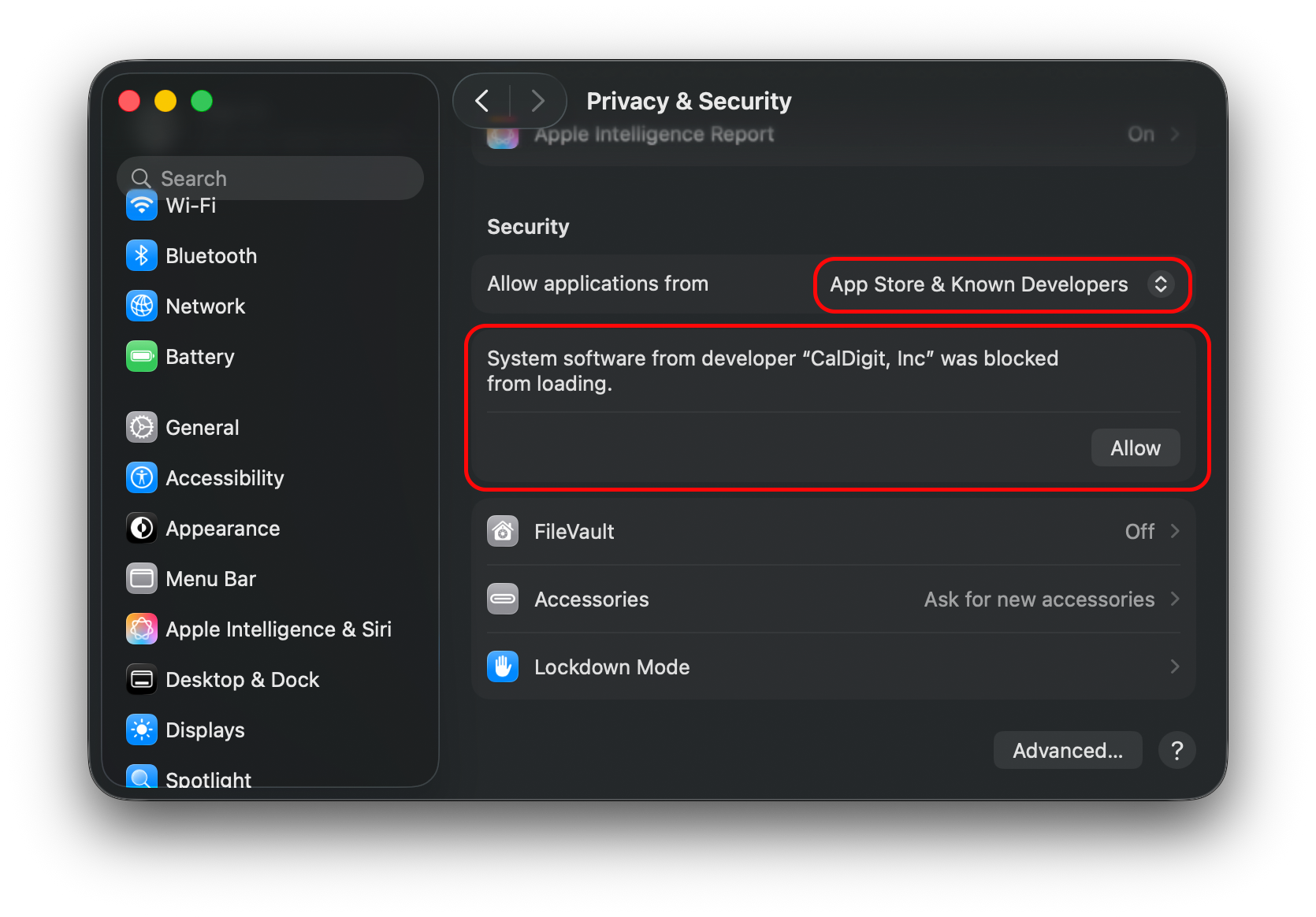 After this, find the notification of the “CalDigit” software being blocked and press “Allow”. You may be prompted for your password during this process.