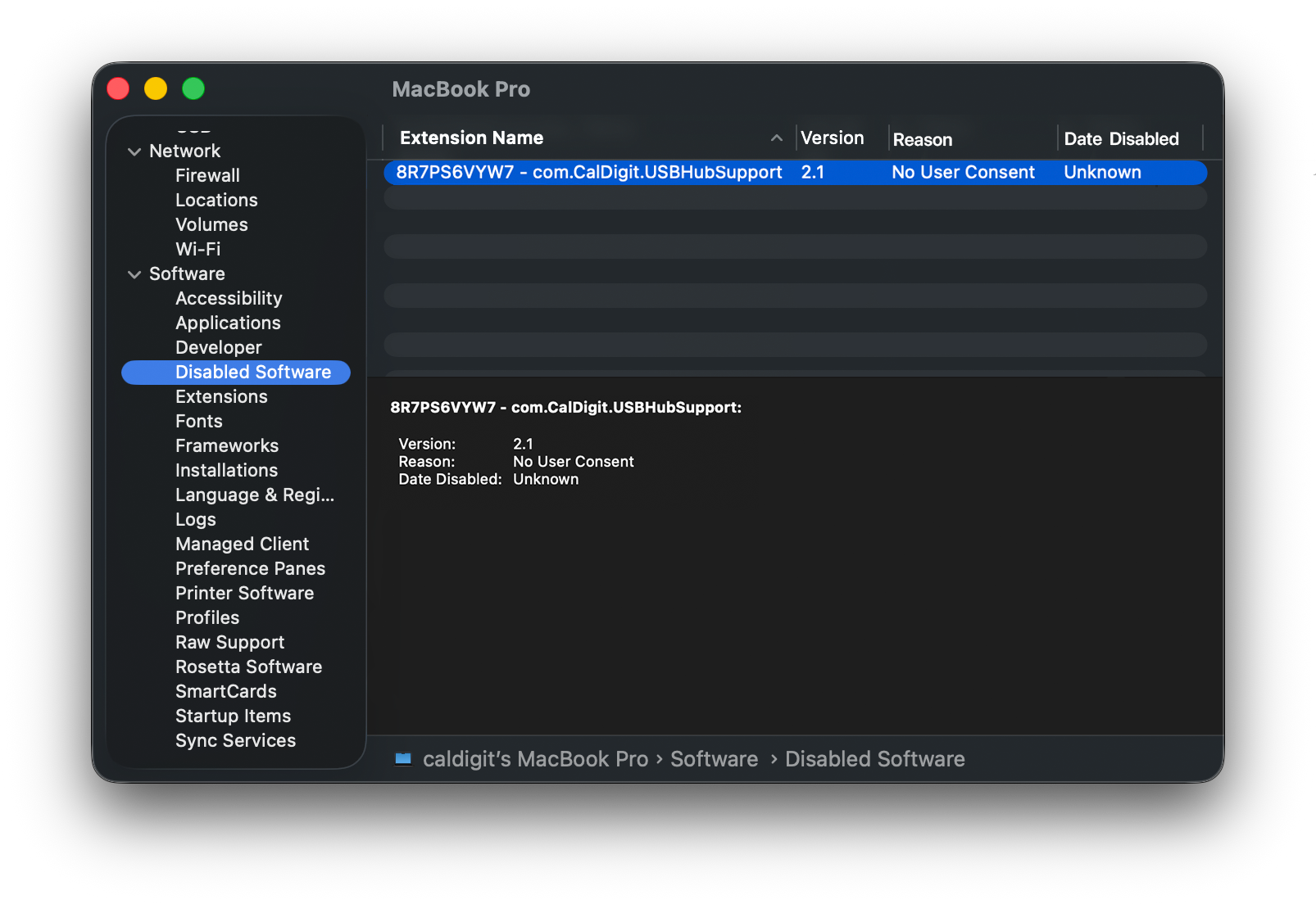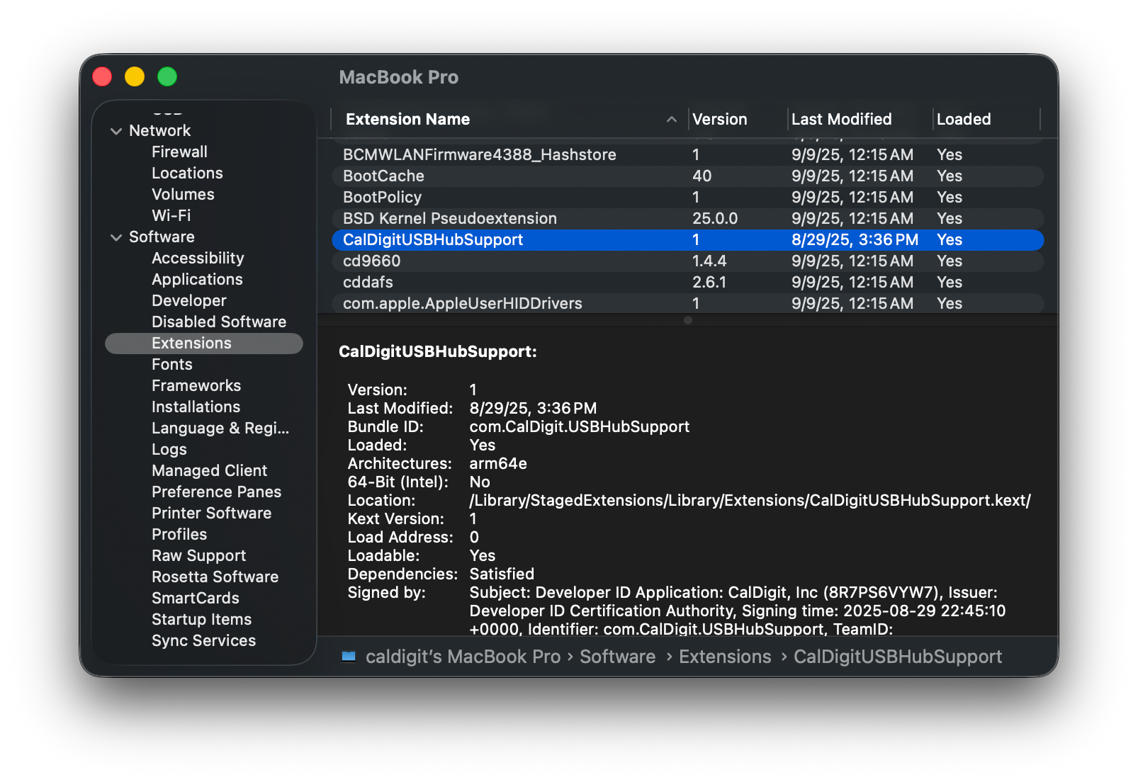 If no driver is present here, let’s check if the driver is properly loaded. From within System Report, select “Extensions” from within the “Software” tab. Find the CalDigit software present here – for the newer version of the driver, it should show up as “CalDigitUSBHubSupport”. Specifically, we want to see if the software is loaded, indicated by the “Loaded” tab on the right of the screen.